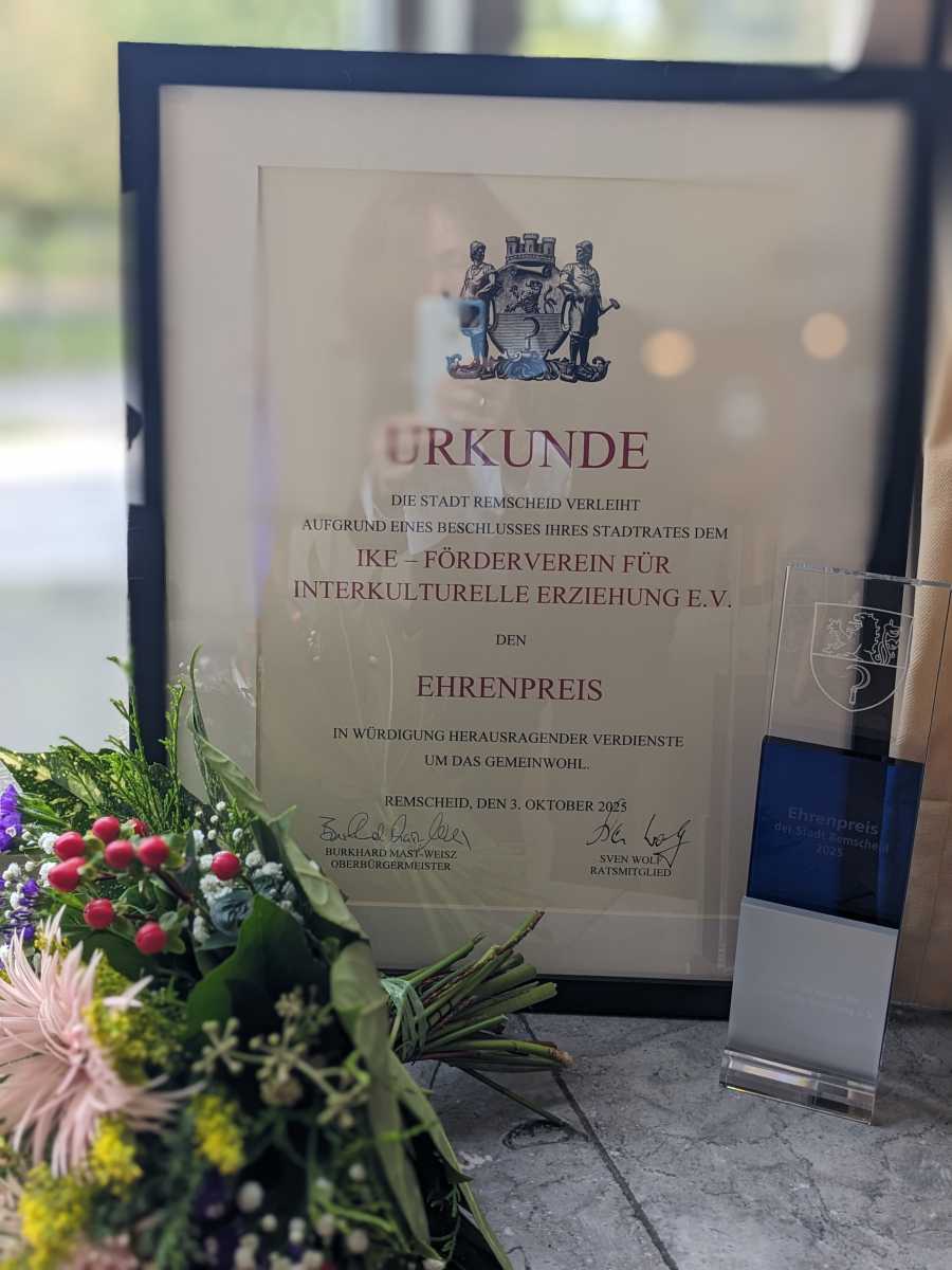 Was für ein unvergesslicher Moment! Am 3. Oktober wurde dem IKE – Förderverein für Interkulturelle Erziehung e.V. der Ehrenpreis der Stadt Remscheid verliehen. Die Preisverleihung aus den Händen von Oberbürgermeister Mast-Weisz fand im Rahmen eines Festaktes im Teo-Otto-Theater statt. Diese Ehrung erfüllt uns mit Stolz und Dankbarkeit – sie ist die Anerkennung für all die Jahre Engagement für interkulturelle Bildung, Vielfalt und Zusammenhalt in unserer Stadt. Wir danken allen, die uns dabei unterstützt haben!